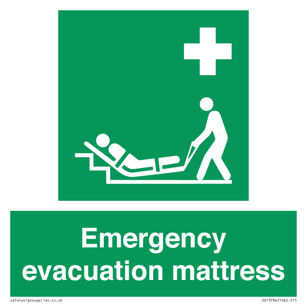 Image content : Human figure lying on a mattress, human figure pulling the mattress from stairs over floor, first aid cross