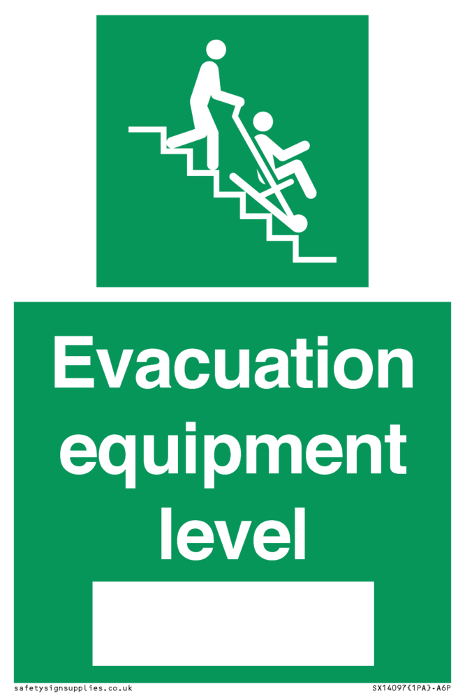 Image content: Human figure sitting in an evacuation chair, human figure handling the evacuation chair, staircase (all right-hand profile).