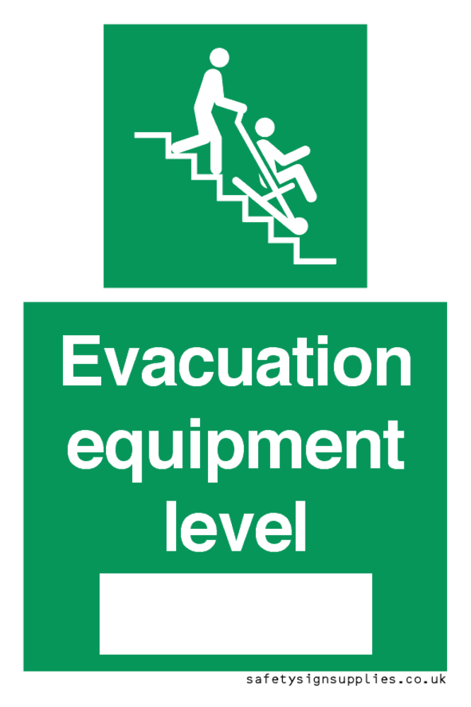 Image content: Human figure sitting in an evacuation chair, human figure handling the evacuation chair, staircase (all right-hand profile).