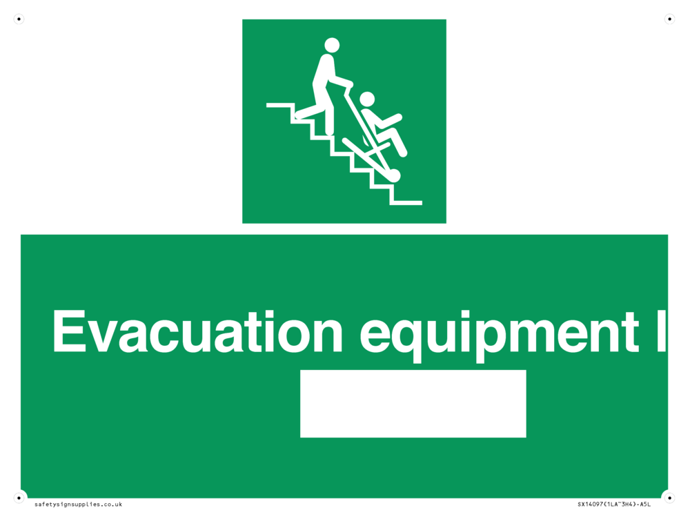 Image content: Human figure sitting in an evacuation chair, human figure handling the evacuation chair, staircase (all right-hand profile).
