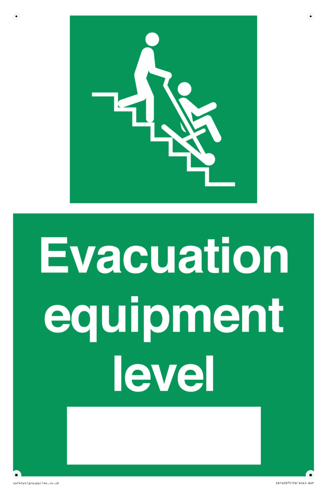 Image content: Human figure sitting in an evacuation chair, human figure handling the evacuation chair, staircase (all right-hand profile).