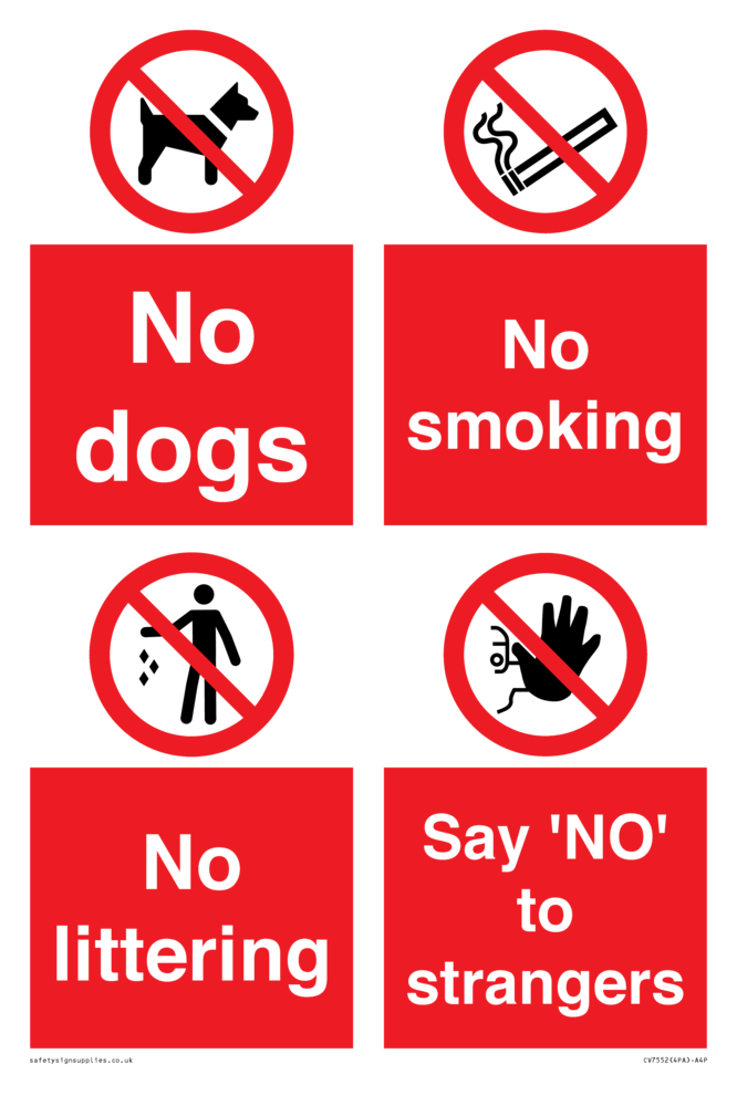 Sign Text: Playground Sign - No dogs, No smoking, No littering, Say 'NO' to strangers
