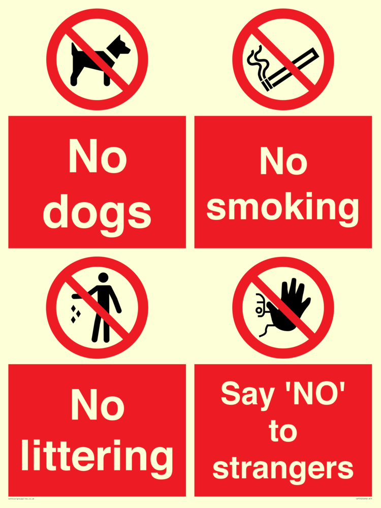 Sign Text: Playground Sign - No dogs, No smoking, No littering, Say 'NO' to strangers