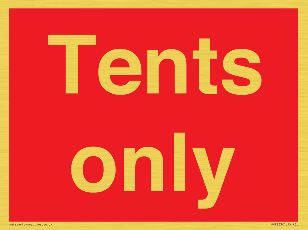 Sign Text: Tents only Product Type: Prohibition Safety Signs Dimensions: 200x150mm Material: Vinyl Gold sticker Orientation: Landscape Text Colour: White More...