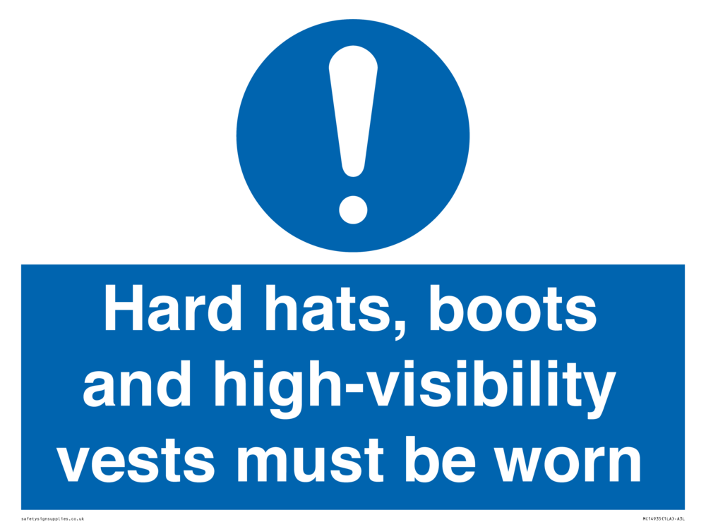 Sign Text: Hard hats, boots and high-visibility vests must be worn
