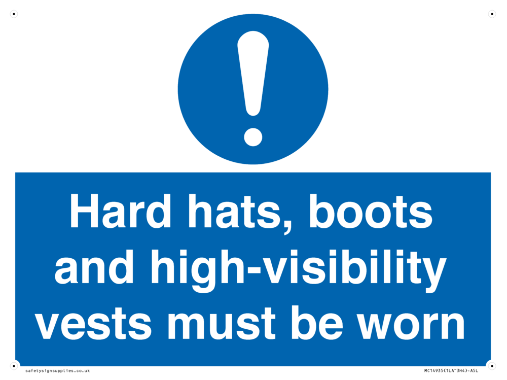 Sign Text: Hard hats, boots and high-visibility vests must be worn