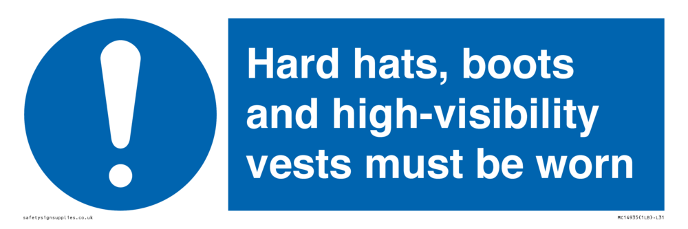 Sign Text: Hard hats, boots and high-visibility vests must be worn