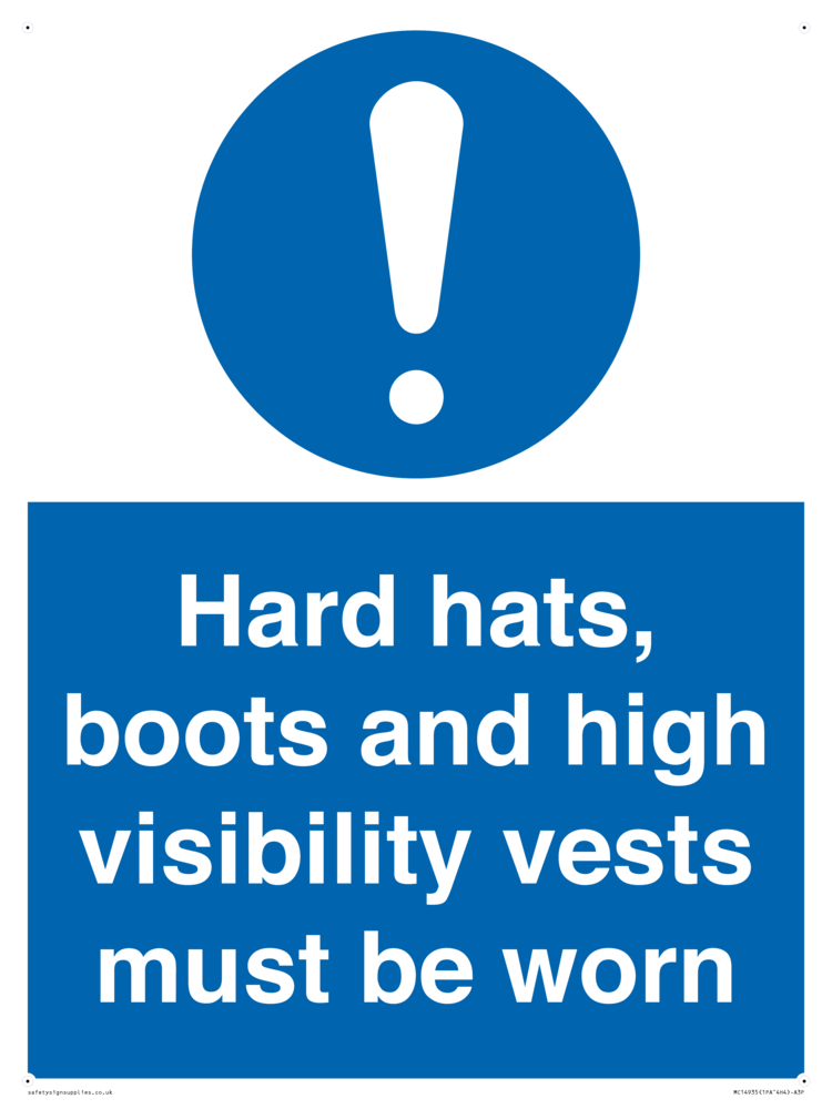 Sign Text: Hard hats, boots and high-visibility vests must be worn