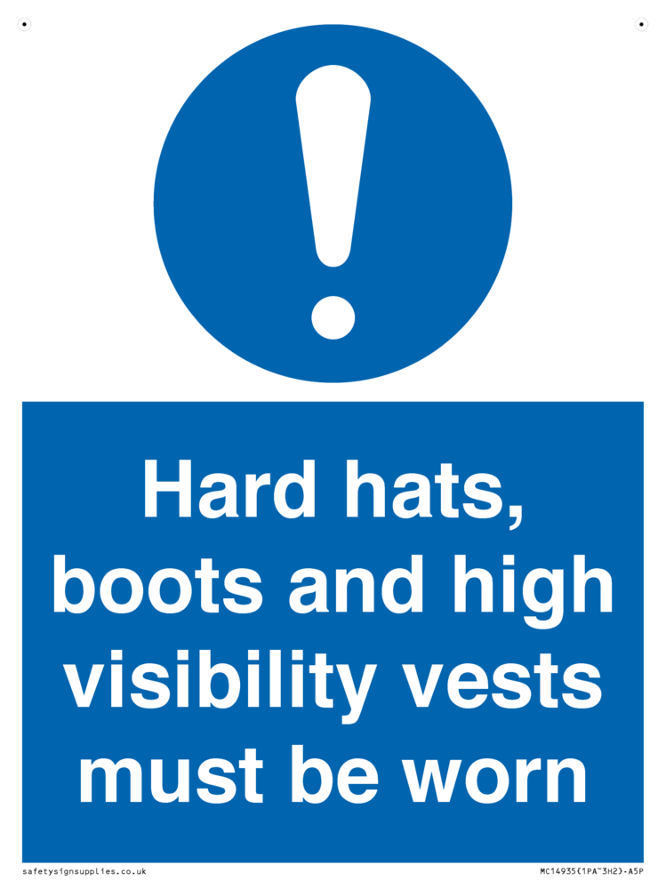 Sign Text: Hard hats, boots and high-visibility vests must be worn