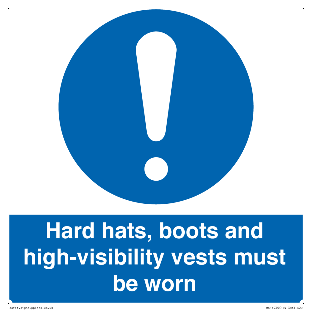 Sign Text: Hard hats, boots and high-visibility vests must be worn