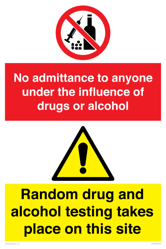 Combined sign for use in hazardous environments like construction sites where employers are obliged to ensure employees are not under the influence of drugs or alcohol and insist on random testing for this.