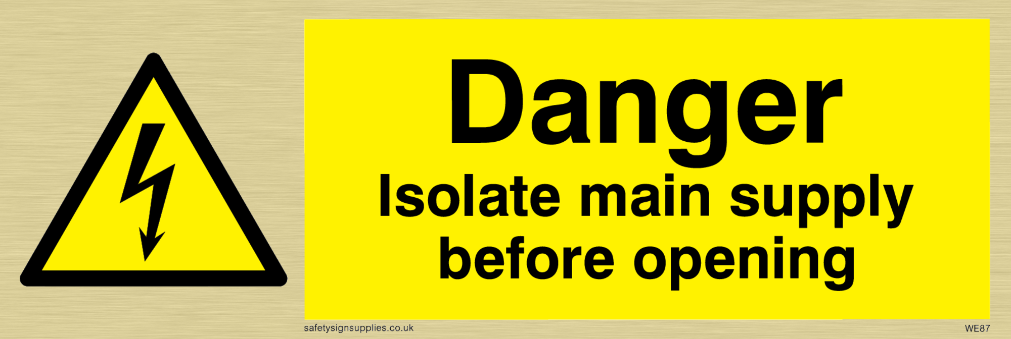 This sign contains an electrical warning symbol. Lightning flash in black on yellow warning triangle with black border.