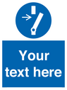 This sign contains an isolation required symbol - hand pulling switch lever in white within blue circle.