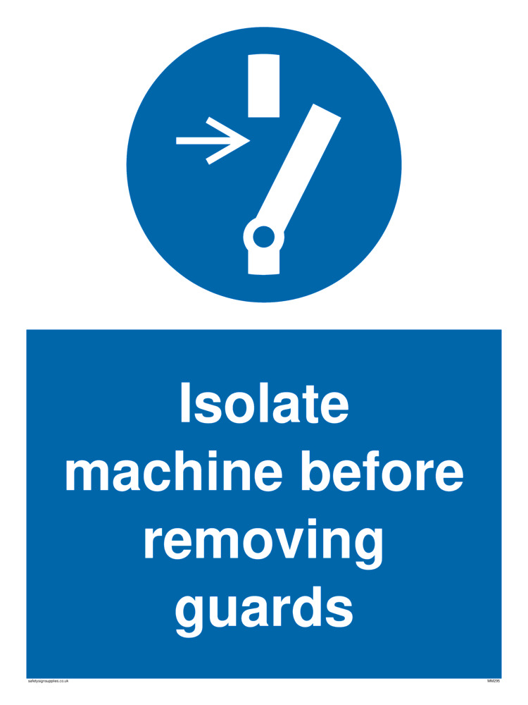 This sign contains an isolation required symbol - hand pulling switch lever in white within blue circle. Comes with a self adhesive backing.