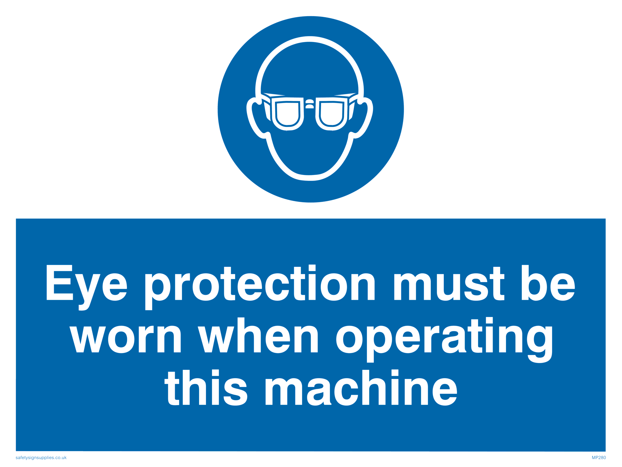 This sign contains an eye protection required symbol - person wearing safety glasses in white within blue circle. Suitable for hanging with a budget hanging kit.