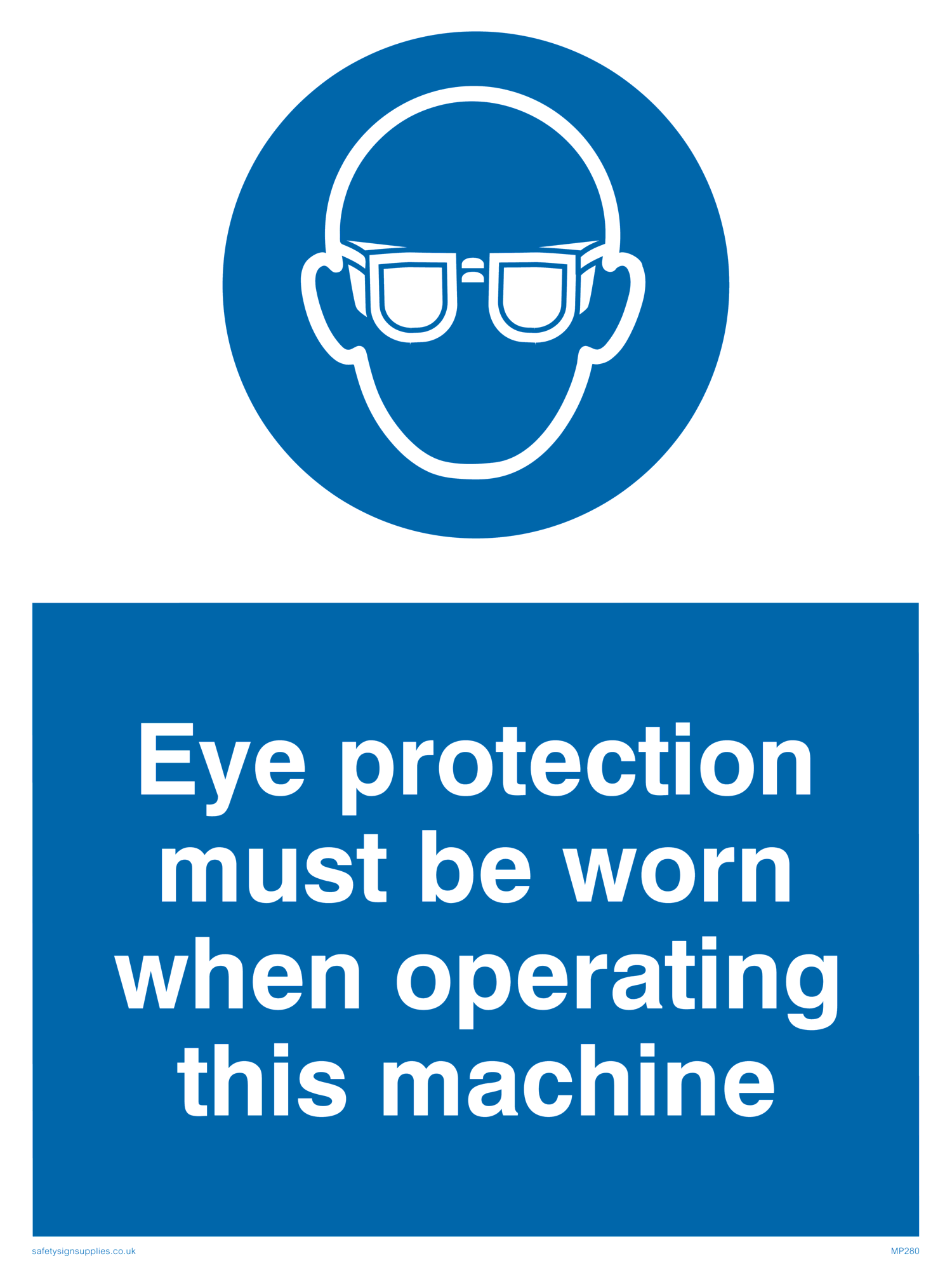 This sign contains an eye protection required symbol - person wearing safety glasses in white within blue circle.