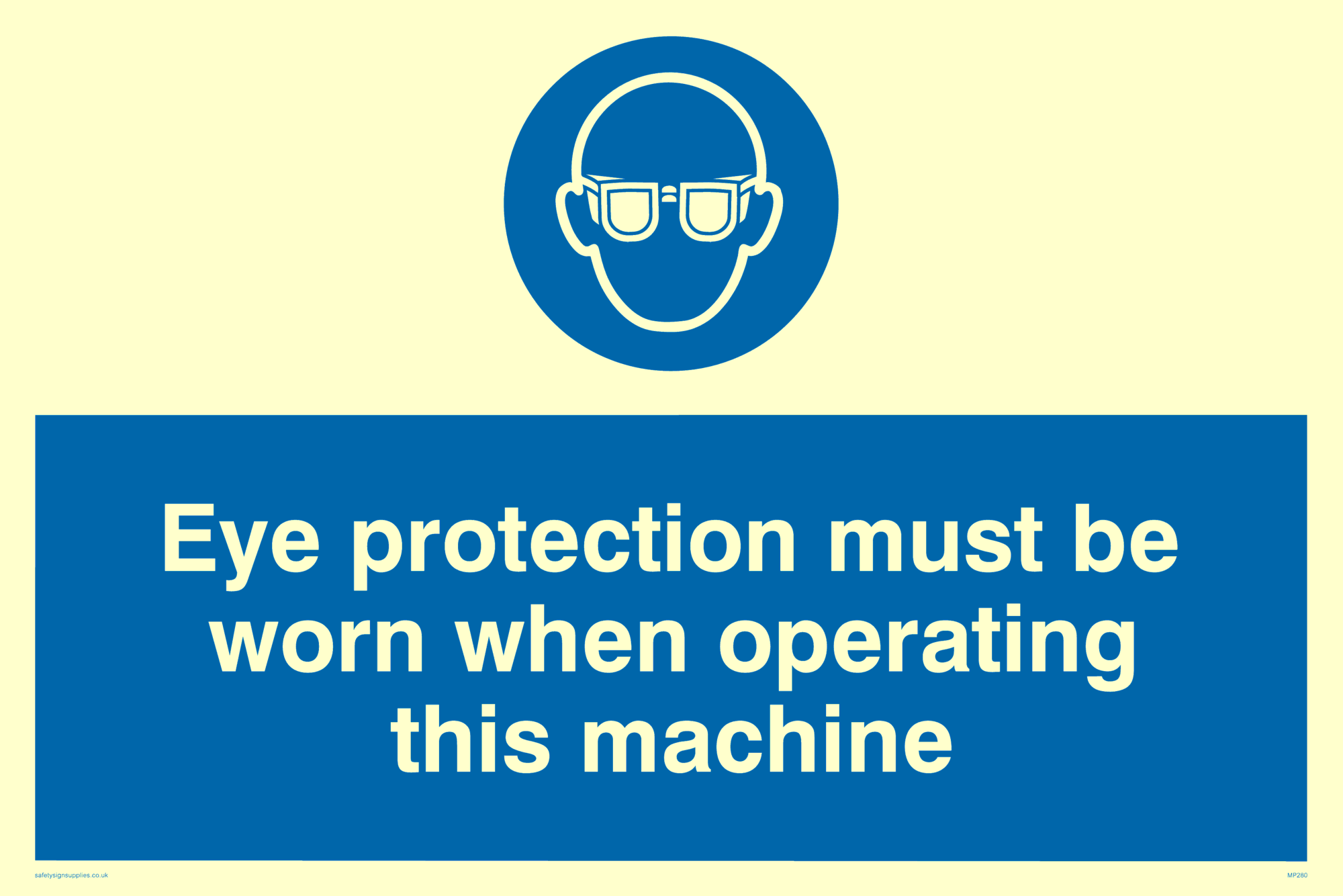 This sign contains an eye protection required symbol - person wearing safety glasses in white within blue circle. Comes with a self adhesive backing.