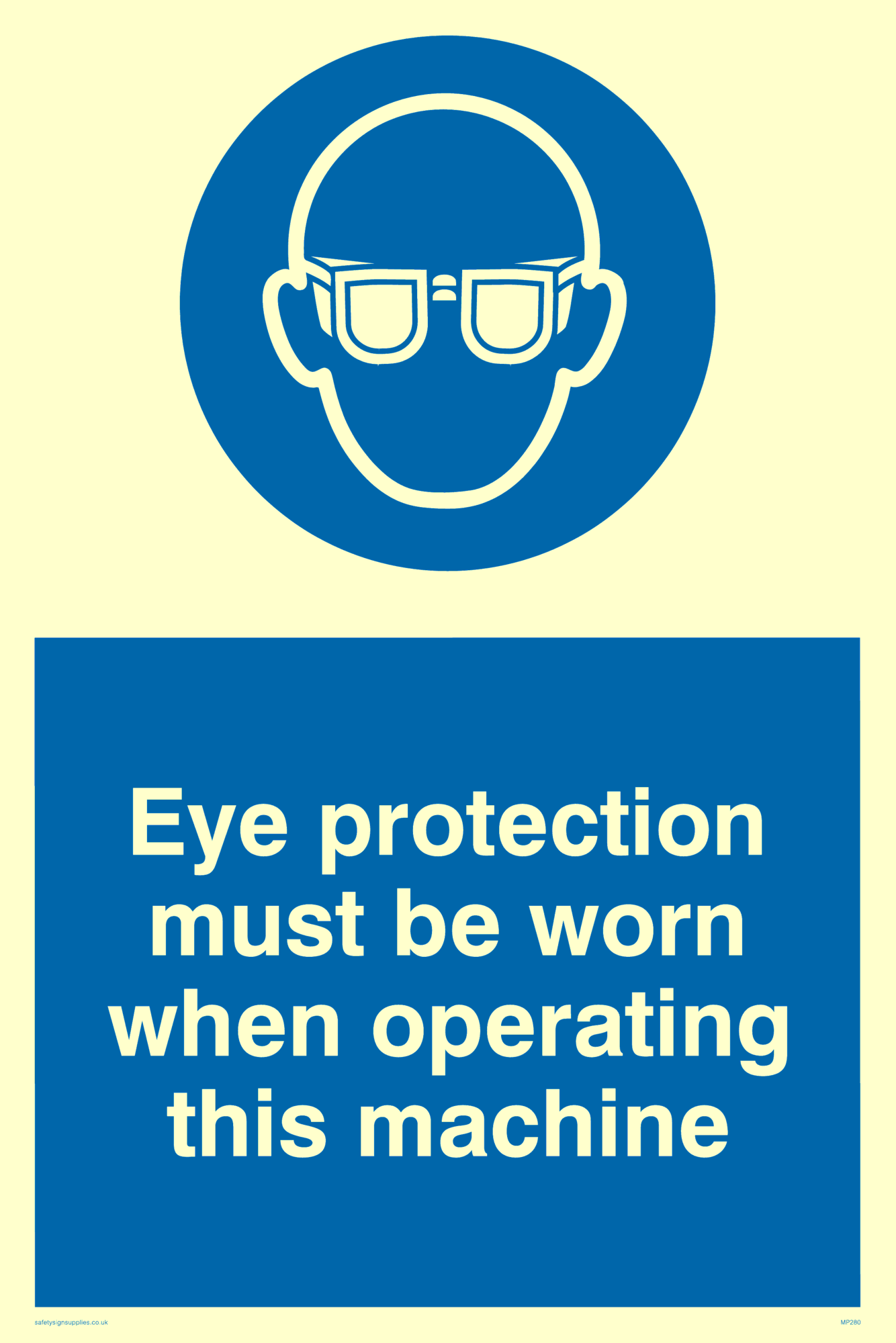 This sign contains an eye protection required symbol - person wearing safety glasses in white within blue circle.