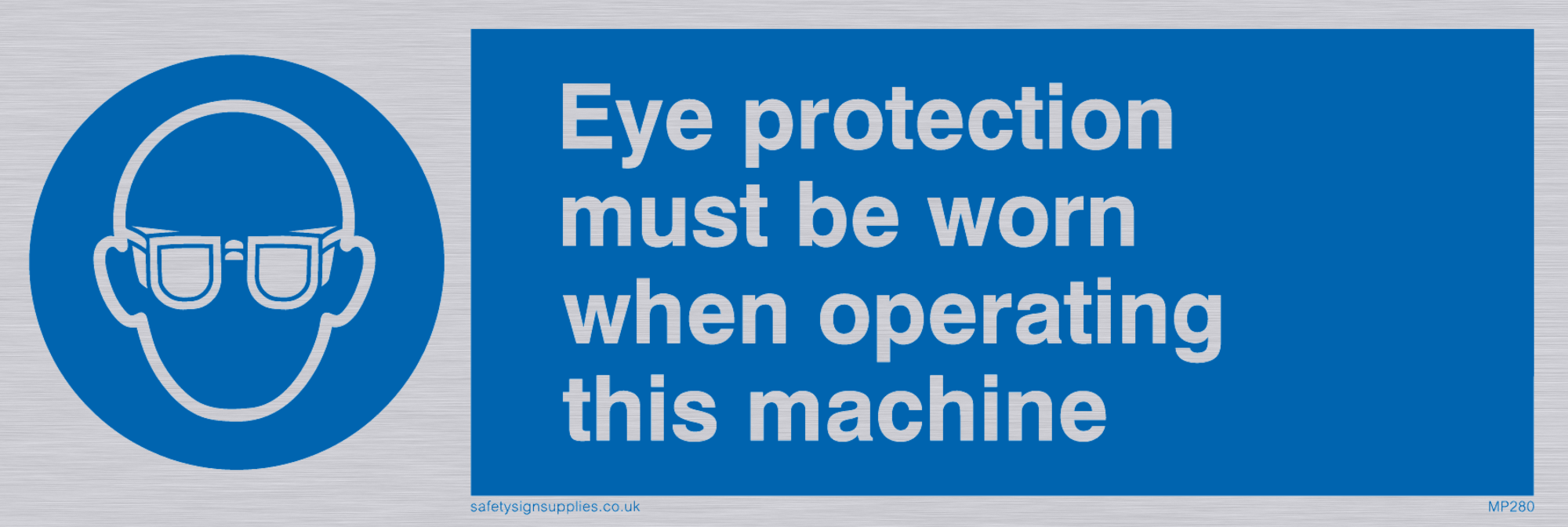 This sign contains an eye protection required symbol - person wearing safety glasses in white within blue circle.