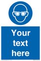 This sign contains an eye protection required symbol - person wearing safety glasses in white within blue circle.