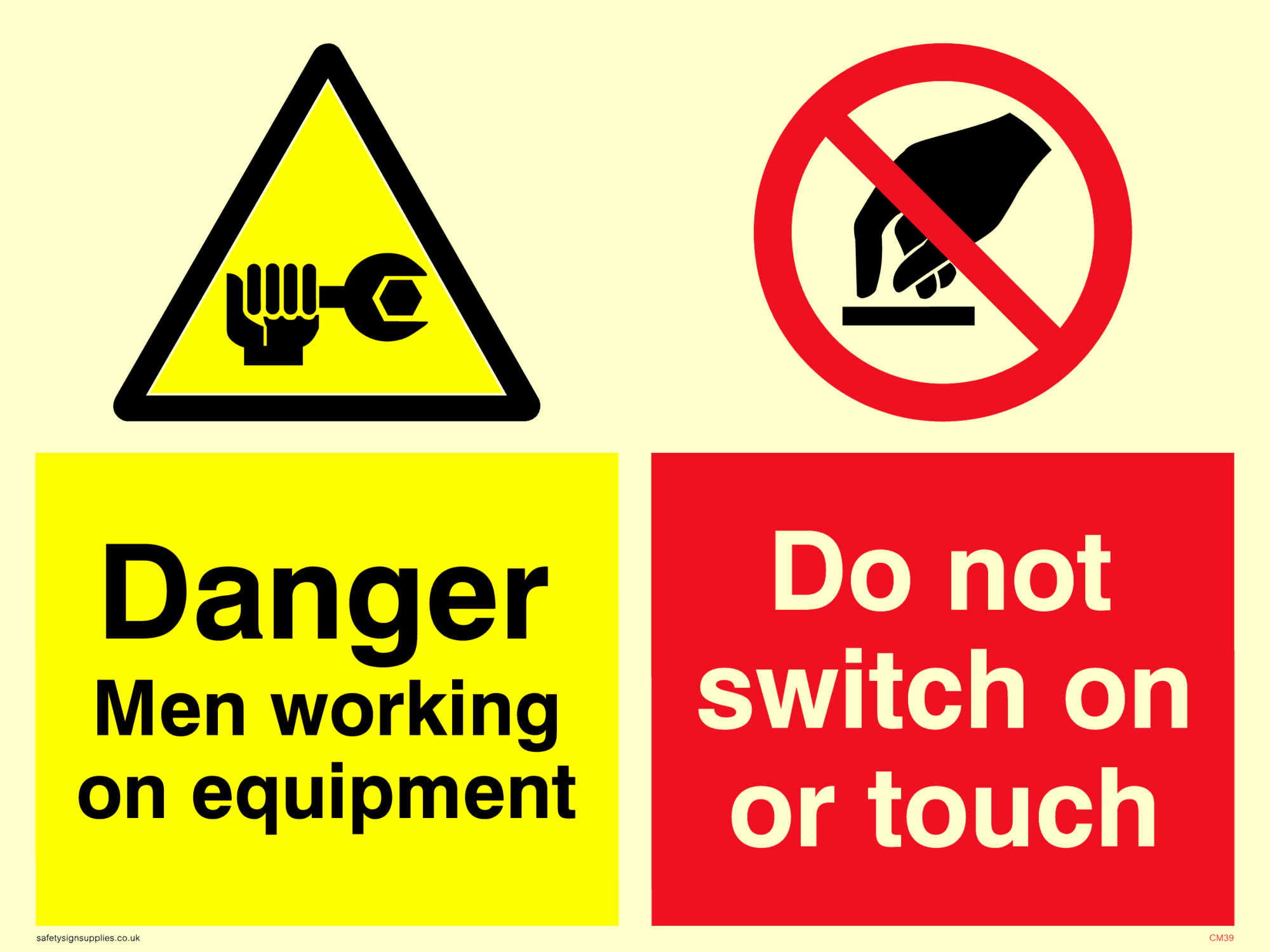 This sign contains a working on equipment warning. Hand holding spanner turning nut in black on yellow warning triangle with black border. Comes with a self adhesive backing.