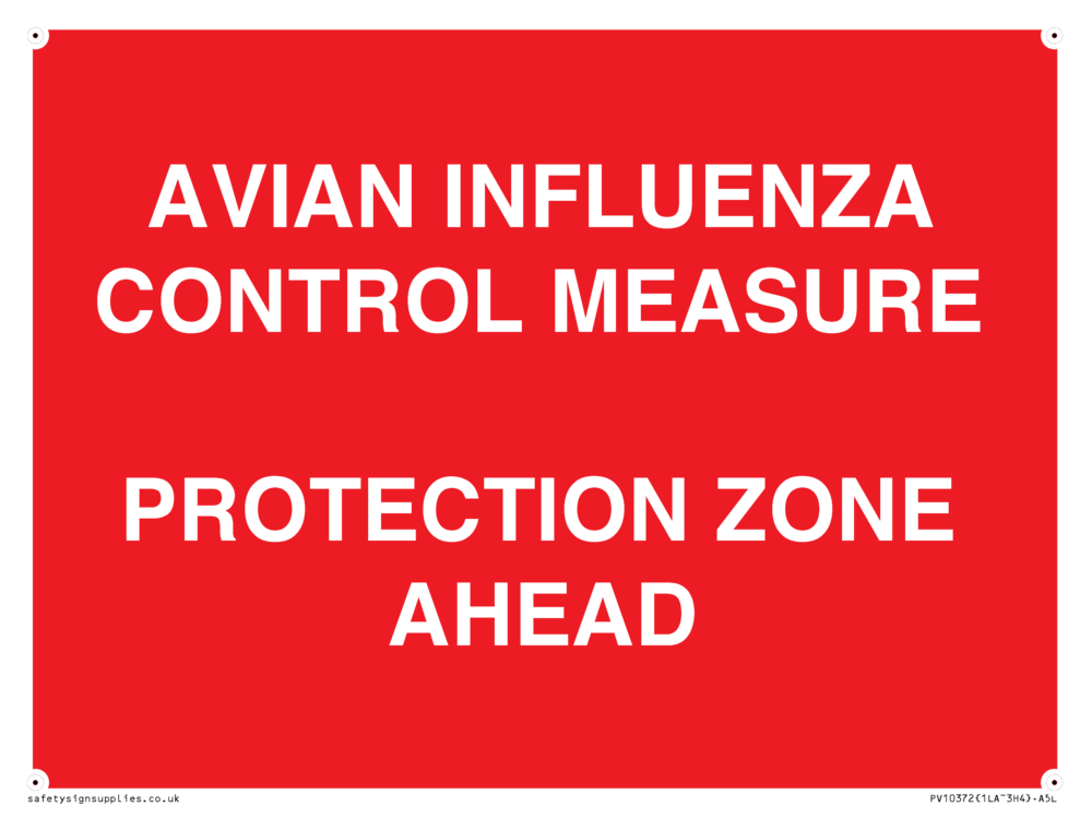 Sign Text: AVIAN INFLUENZA CONTROL MEASURE PROTECTION ZONE AHEAD