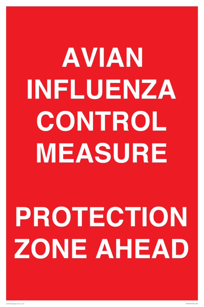 Sign Text: AVIAN INFLUENZA CONTROL MEASURE PROTECTION ZONE AHEAD