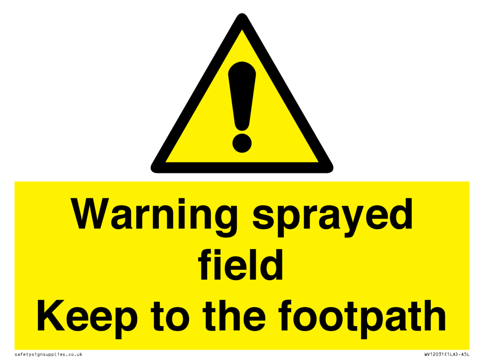 Sign Text: Warning sprayed field Keep to the footpath