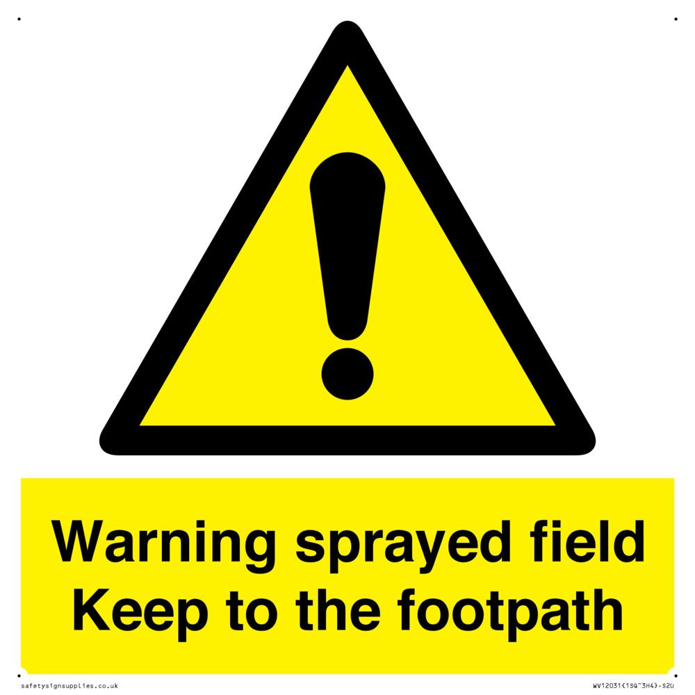 Sign Text: Warning sprayed field Keep to the footpath