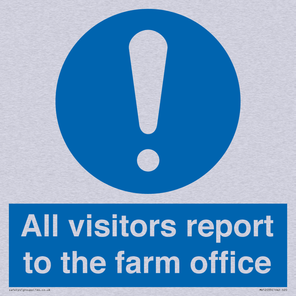 Sign Text: All visitors report to the farm office