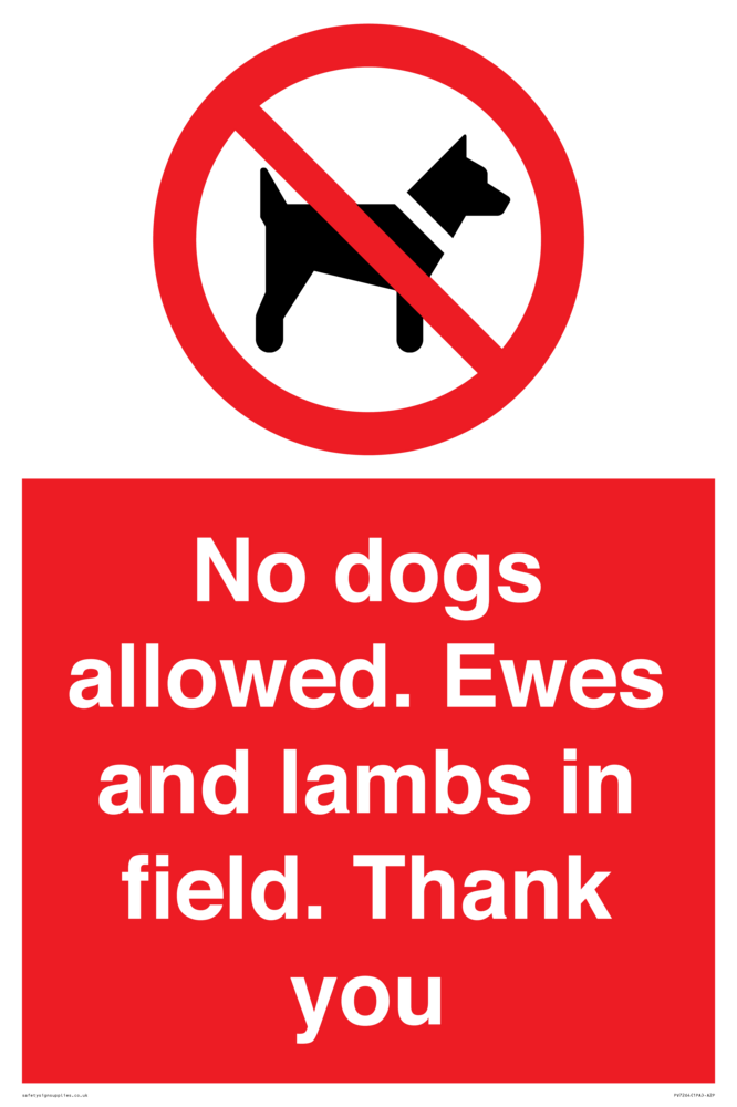 Sign Text: No dogs allowed. Ewes and lambs in field. Thank you
