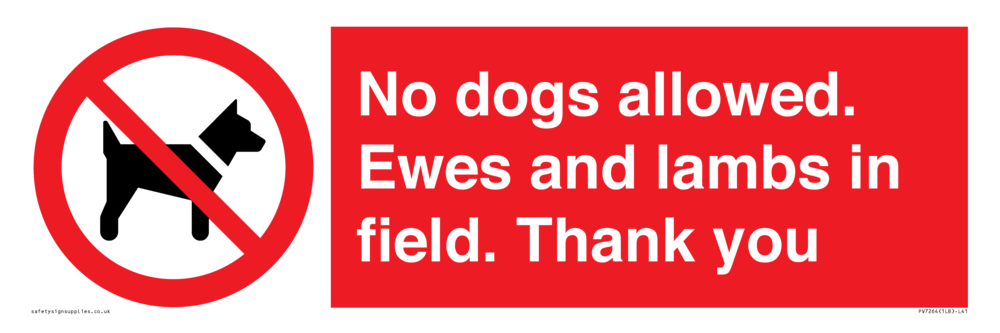 Sign Text: No dogs allowed. Ewes and lambs in field. Thank you