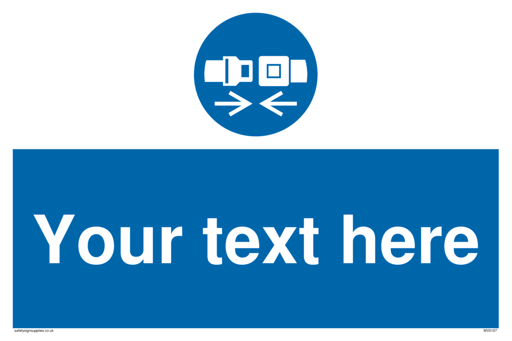 This sign contains a seatbelt must be worn symbol. Person wearing a seat belt in white on a blue circle.