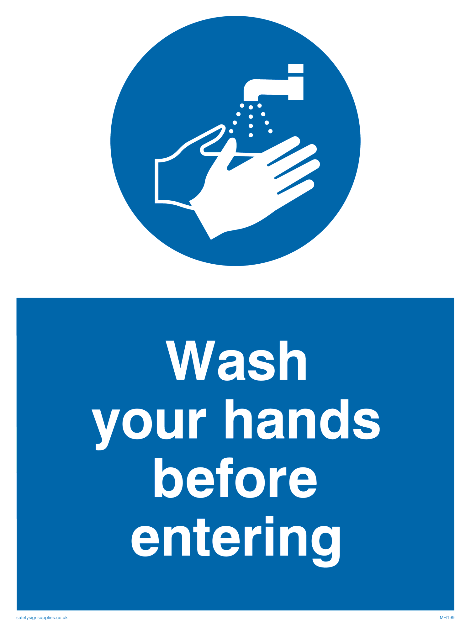This sign contains a wash hands symbol - person washing hands under running tap in white within blue circle.