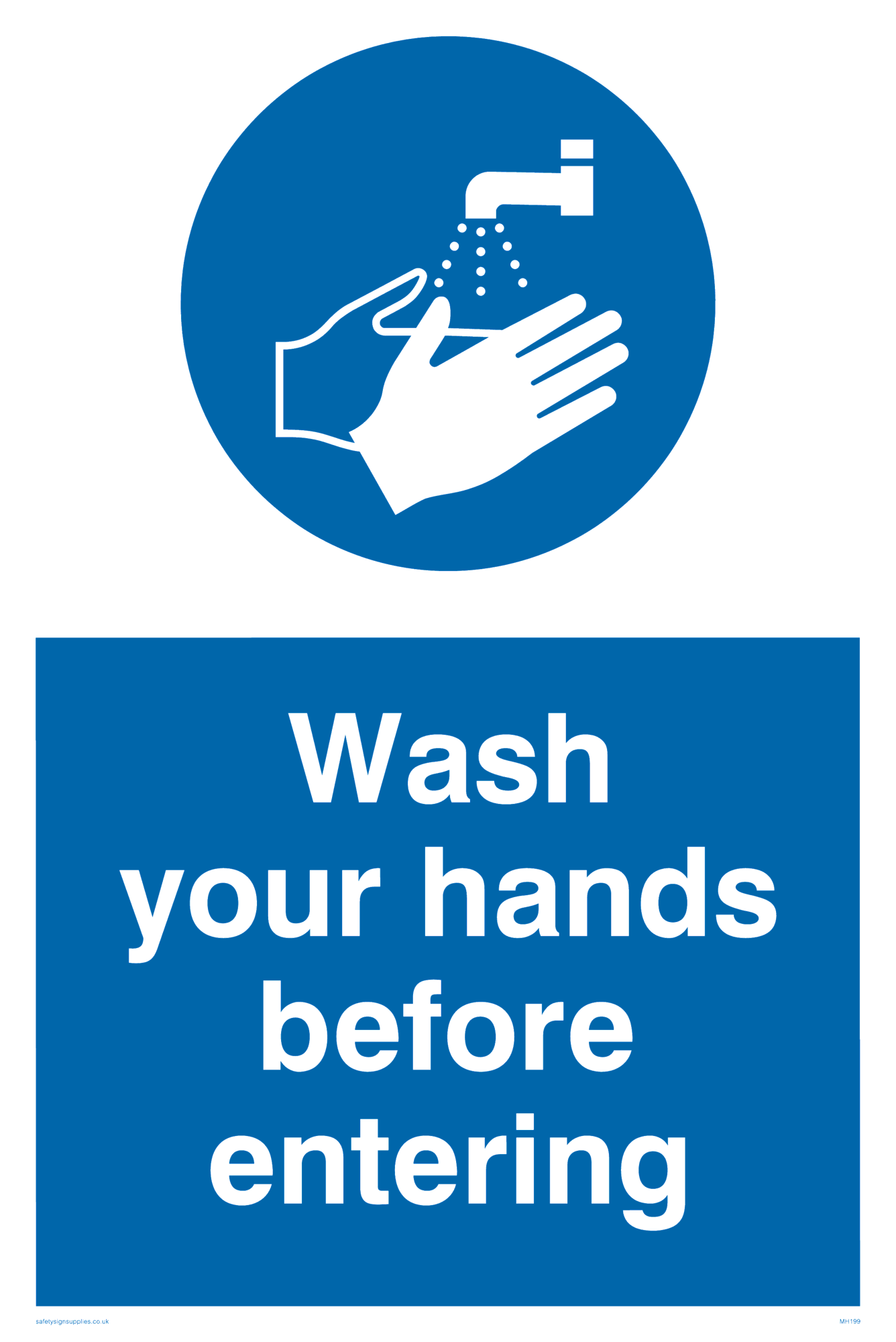 This sign contains a wash hands symbol - person washing hands under running tap in white within blue circle.
