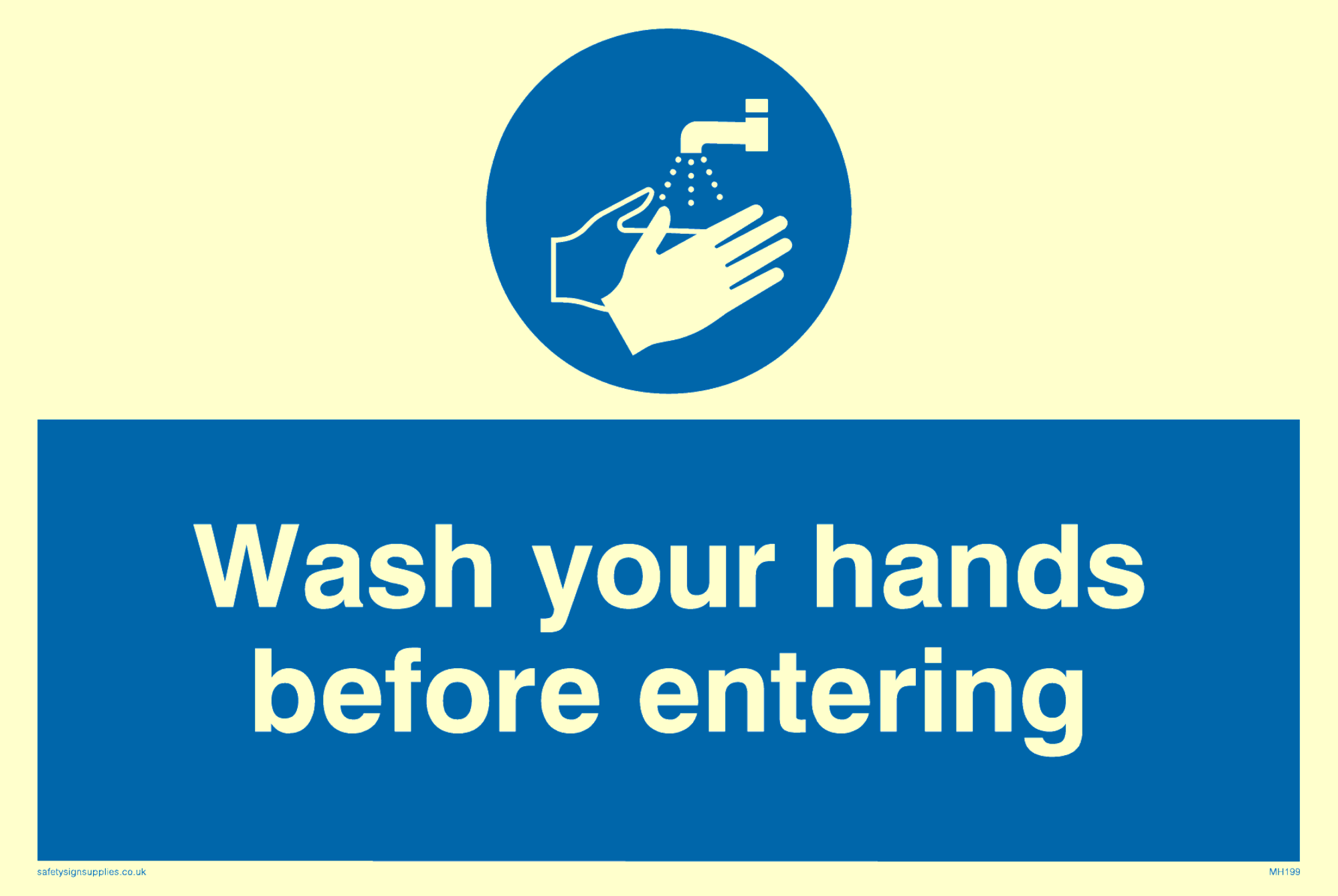 This sign contains a wash hands symbol - person washing hands under running tap in white within blue circle.