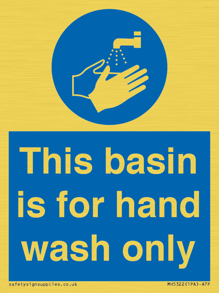 Sign Text: This basin is for hand wash only Dimensions: 75x100mm Material: Plastic Semi-rigid Gold Orientation: Portrait Text Colour: White Background Colour: Blue More...