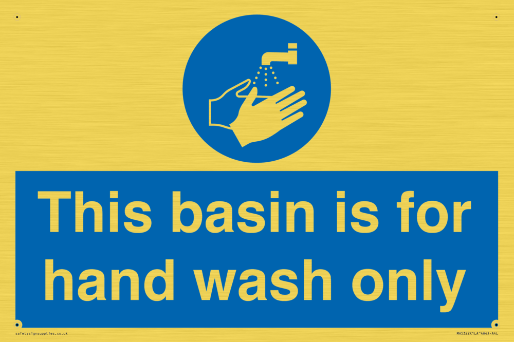 Sign Text: This basin is for hand wash only Dimensions: 300x200mm Material: Plastic Semi-rigid Gold Orientation: Landscape Text Colour: White Background Colour: Blue More...