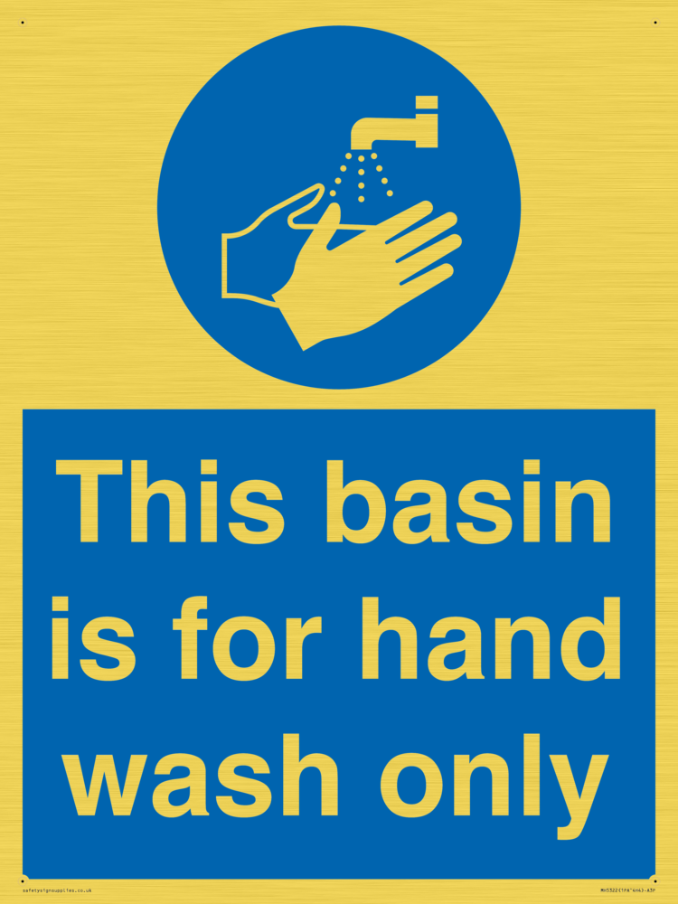 Sign Text: This basin is for hand wash only Dimensions: 300x400mm Material: Plastic Semi-rigid Gold Orientation: Portrait Text Colour: White Background Colour: Blue More...