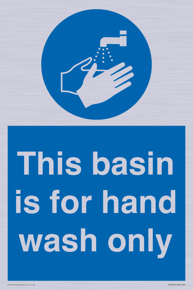 Sign Text: This basin is for hand wash only Dimensions: 200x300mm Material: Plastic Semi-rigid Silver Orientation: Portrait Text Colour: White Background Colour: Blue More...