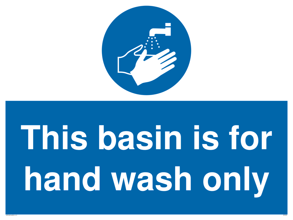 This sign contains a wash hands symbol - person washing hands under running tap in white within blue circle.