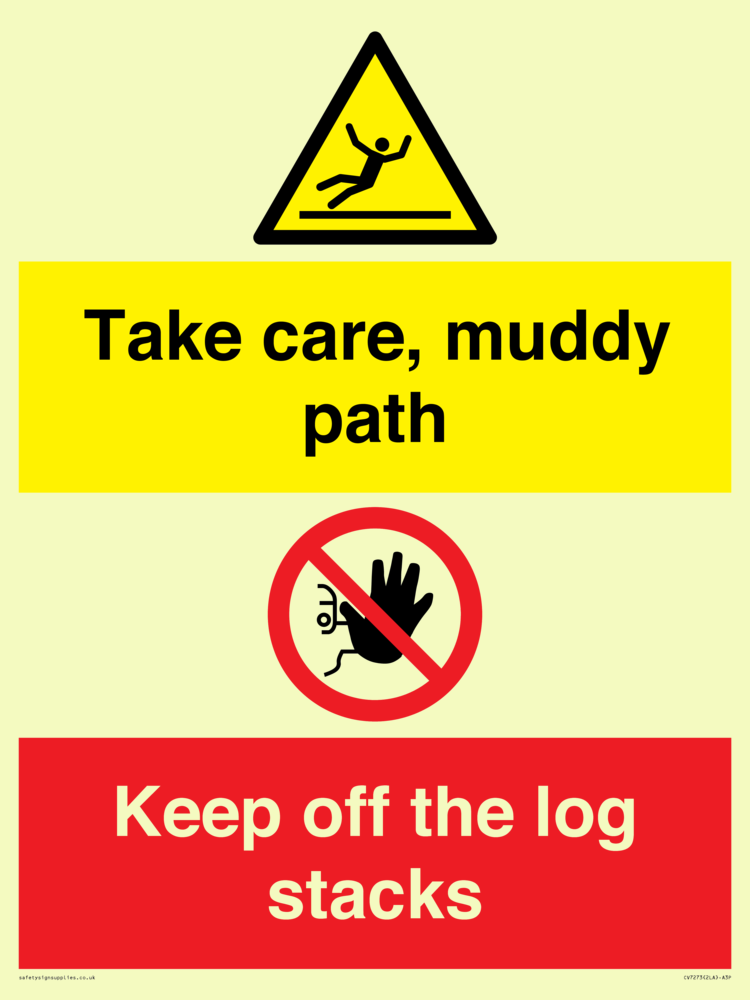Sign Text: Take care, muddy path Keep off the logs stacks