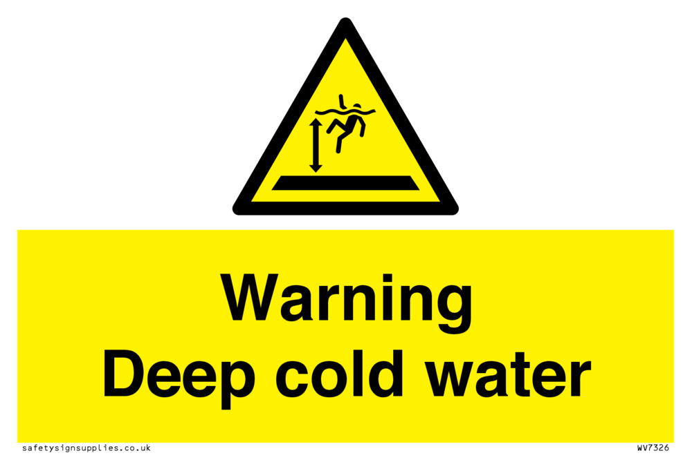 This sign contains a deep water warning symbol. Person standing next to drop into deep water in black on yellow warning triangle with black border.