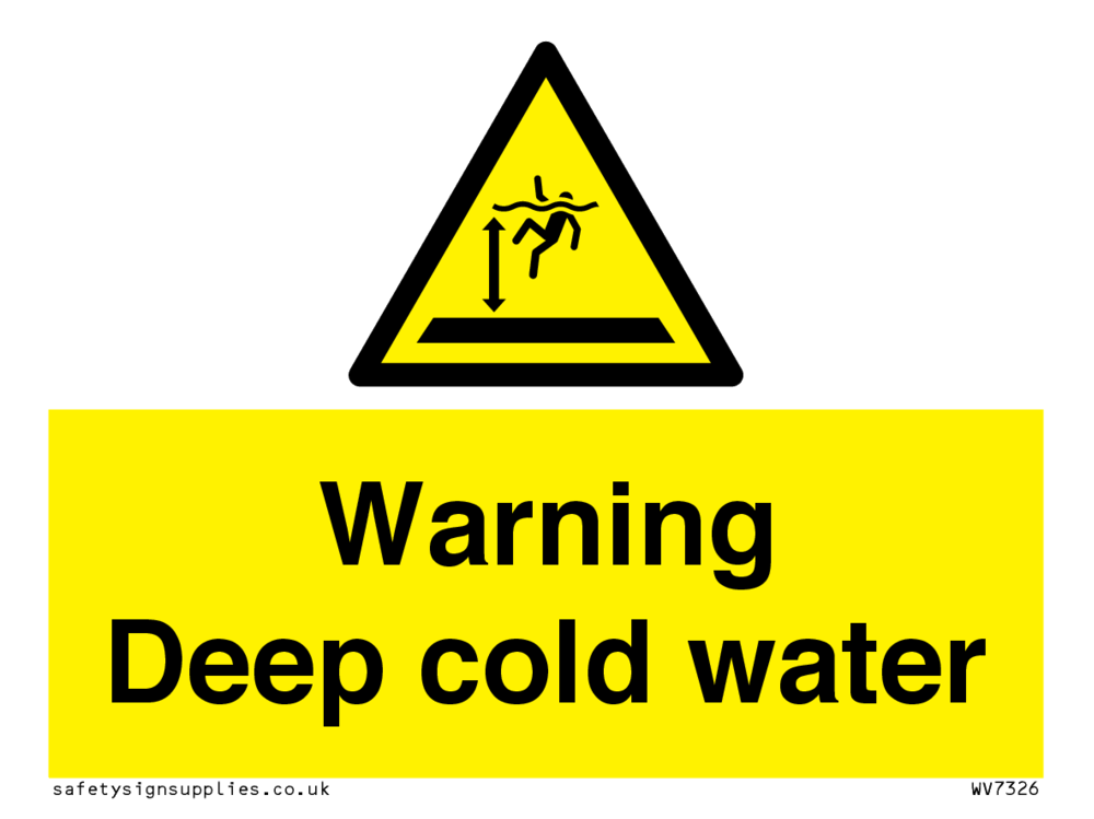 This sign contains a deep water warning symbol. Person standing next to drop into deep water in black on yellow warning triangle with black border.