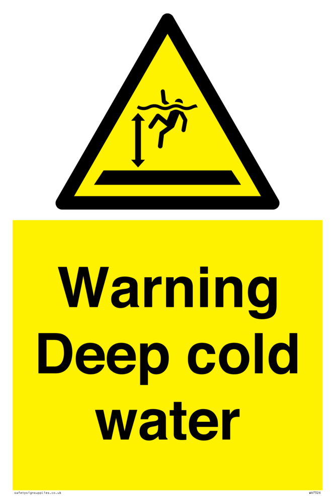 This sign contains a deep water warning symbol. Person standing next to drop into deep water in black on yellow warning triangle with black border.
