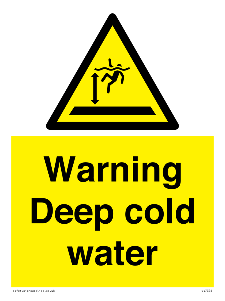 This sign contains a deep water warning symbol. Person standing next to drop into deep water in black on yellow warning triangle with black border.