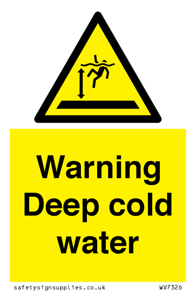 This sign contains a deep water warning symbol. Person standing next to drop into deep water in black on yellow warning triangle with black border.