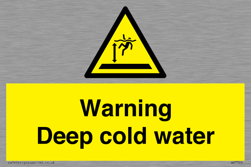 This sign contains a deep water warning symbol. Person standing next to drop into deep water in black on yellow warning triangle with black border.