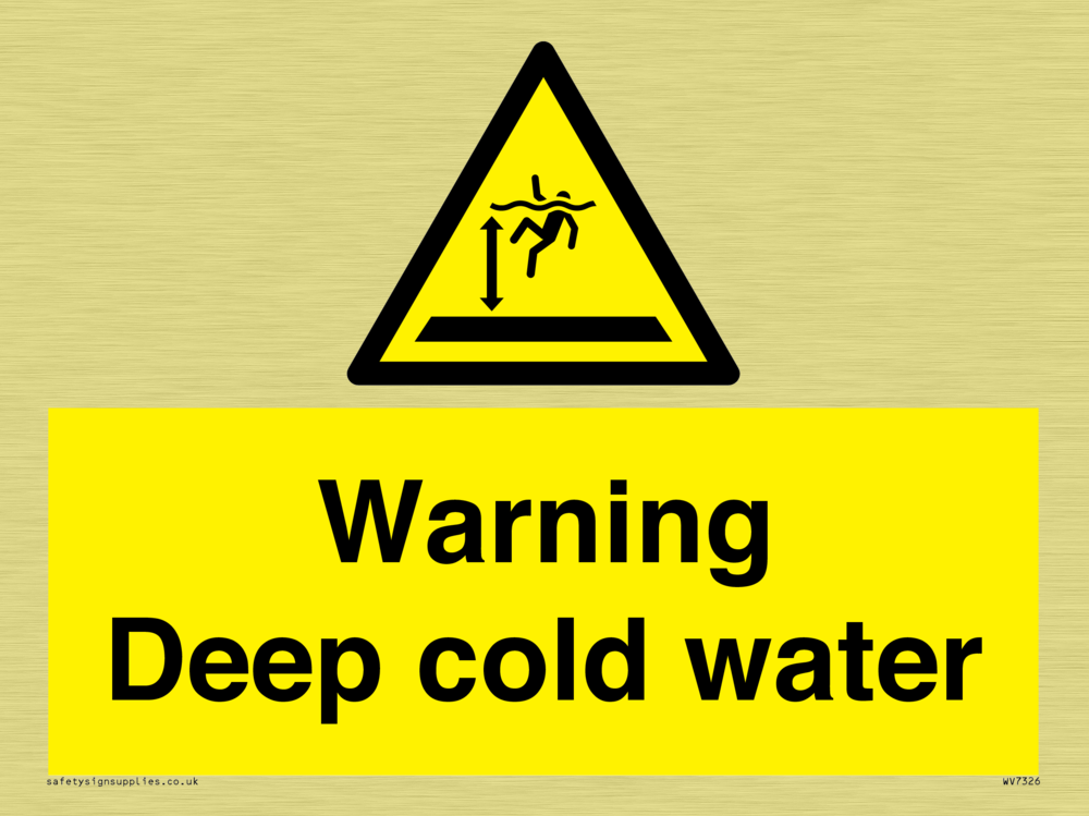 This sign contains a deep water warning symbol. Person standing next to drop into deep water in black on yellow warning triangle with black border.
