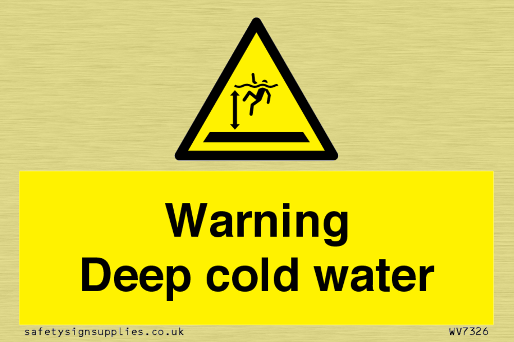 This sign contains a deep water warning symbol. Person standing next to drop into deep water in black on yellow warning triangle with black border.